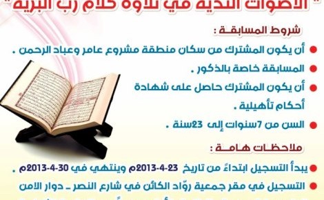 Rowad Association for Community Development, in cooperation with Holy Quran and Sunnah Association, launched Holy Quran competition entitled "Enchanting Voices in the Recitation of words of the Almighty Allah". The competition is interested in charming enchanting voices from Amer projects and Ebad Elrahman areas.