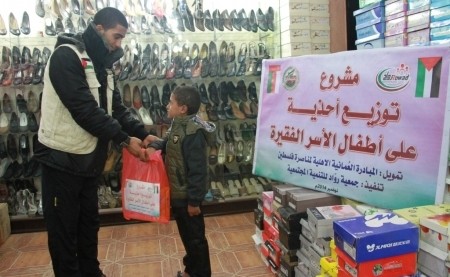 With a funding of Tripoli Association, Libya, "Rowad" distributes shoes to the poor families inGaza City.
