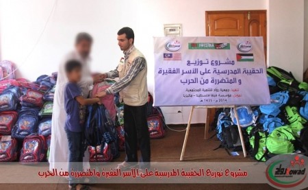إنطلاقاً من الواجب الإنساني وخدمة لأبناء شعبنا العظيم في هذه الظروف الصعبة، قامت جمعية روّاد للتنمية المجتمعية بتوزيع 1000 حقيبة مدرسية وقرطاسية على الاسر الفقيرة والمتضررة جراء الحرب الاخيرة على غزة وذلك بدعم كريم من مؤسسة فيفا فلسطينا ماليزيا، حيث يتزامن تنفيذ هذا المشروع مع اقتراب موعد العام الدراسي الجديد.