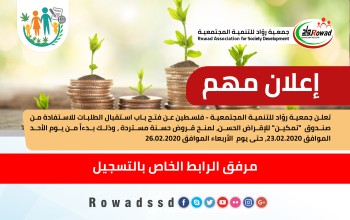 تعلن جمعية روّاد للتنمية المجتمعية - فلسطين عن فتح باب استقبال الطلبات للاستفادة من صندوق "تمكين" للإقراض الحسن، لمنح قروض ح ...