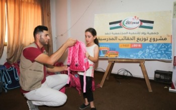 "روّاد" تــوزع حقائــب مدرسيــة علــى الطلبـــة الفقـــراء بغــــزة