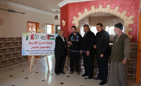 من جانبه قام كل من رئيس مجلس إدارة الجمعية أ. رباح بخيت وأ. رائد الساعاتي أمين الصندوق ومدير الجمعية م. محمد أبو سيدو بتسليم مفتاح الشقة لعائلة الجريح التي تعاني الفقر الشديد والمصنفة ضمن الاسر المستورة الفقيرة بغزة.