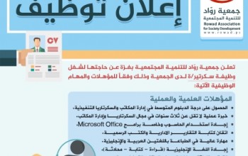 تعلن جمعية روّاد للتنمية المجتمعية بغزة عن حاجتها لشغل وظيفة سكرتير/ة لدى الجمعية وذلك وفقاً للمؤهلات والمهام الوظيفية الآتية: &n ...