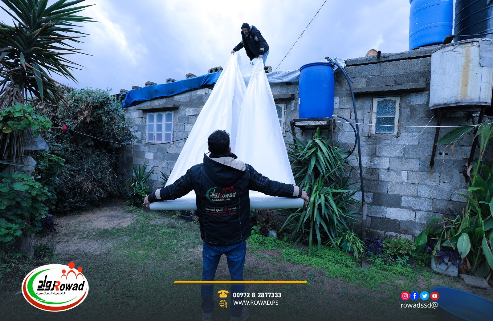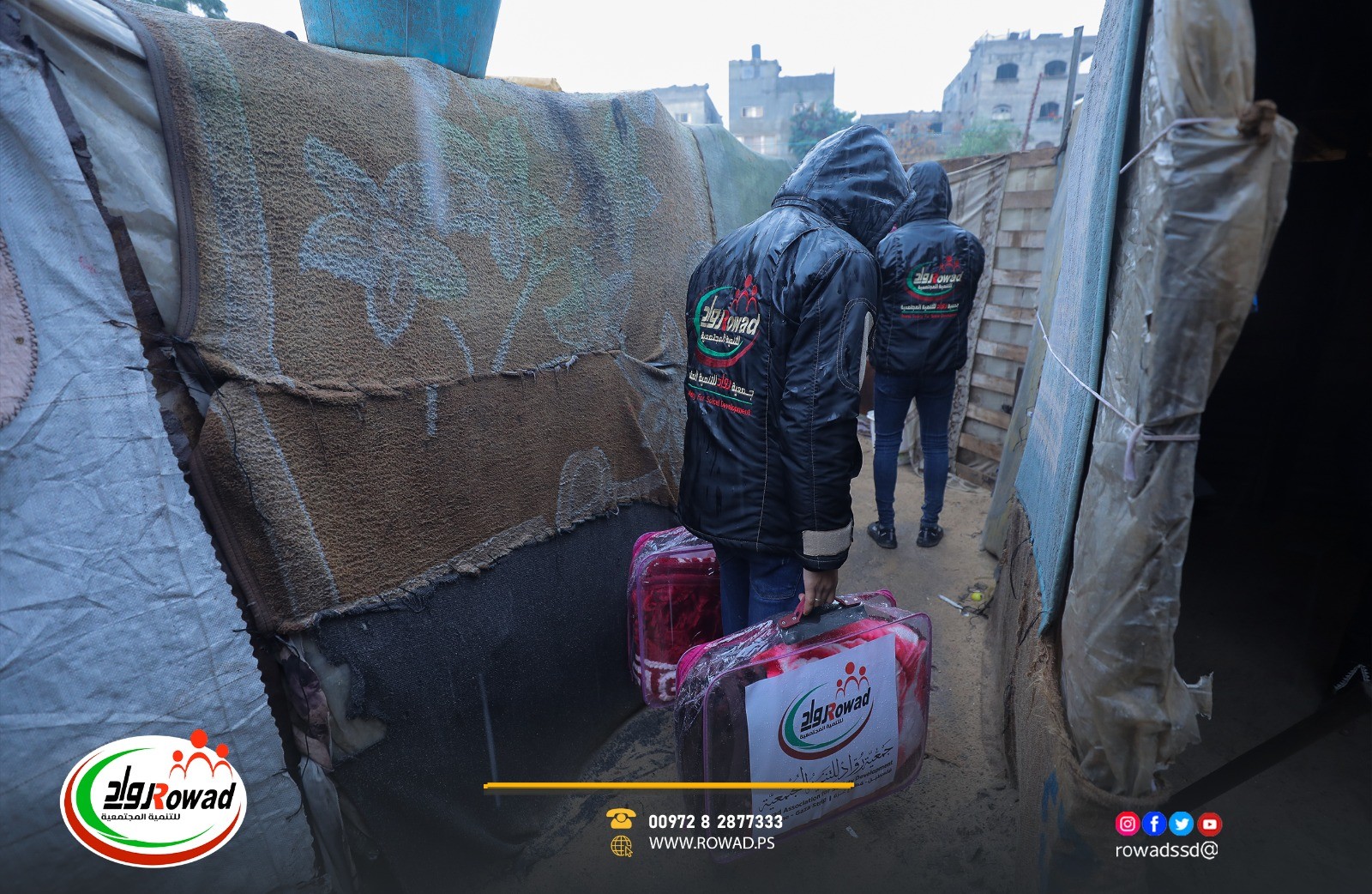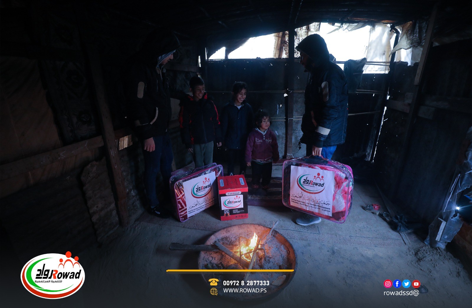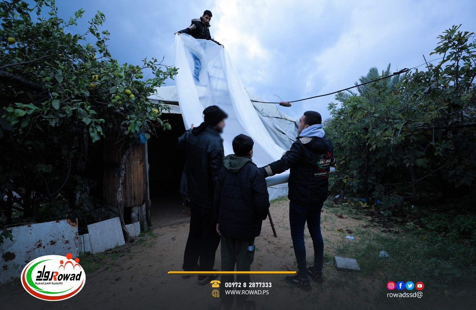 فريق جمعية رواد يواصل عمله منذ ساعات الصباح الباكر حتى هذه اللحظات في تفقد عشرات البيوت المستورة وتأمينهم بالطرود التموينية والكسوة الشتوية الكاملة بالإضافة للبطانيات الحرارية والمَدافِئ وتغطية البيوت المهترئة بالنايلون.