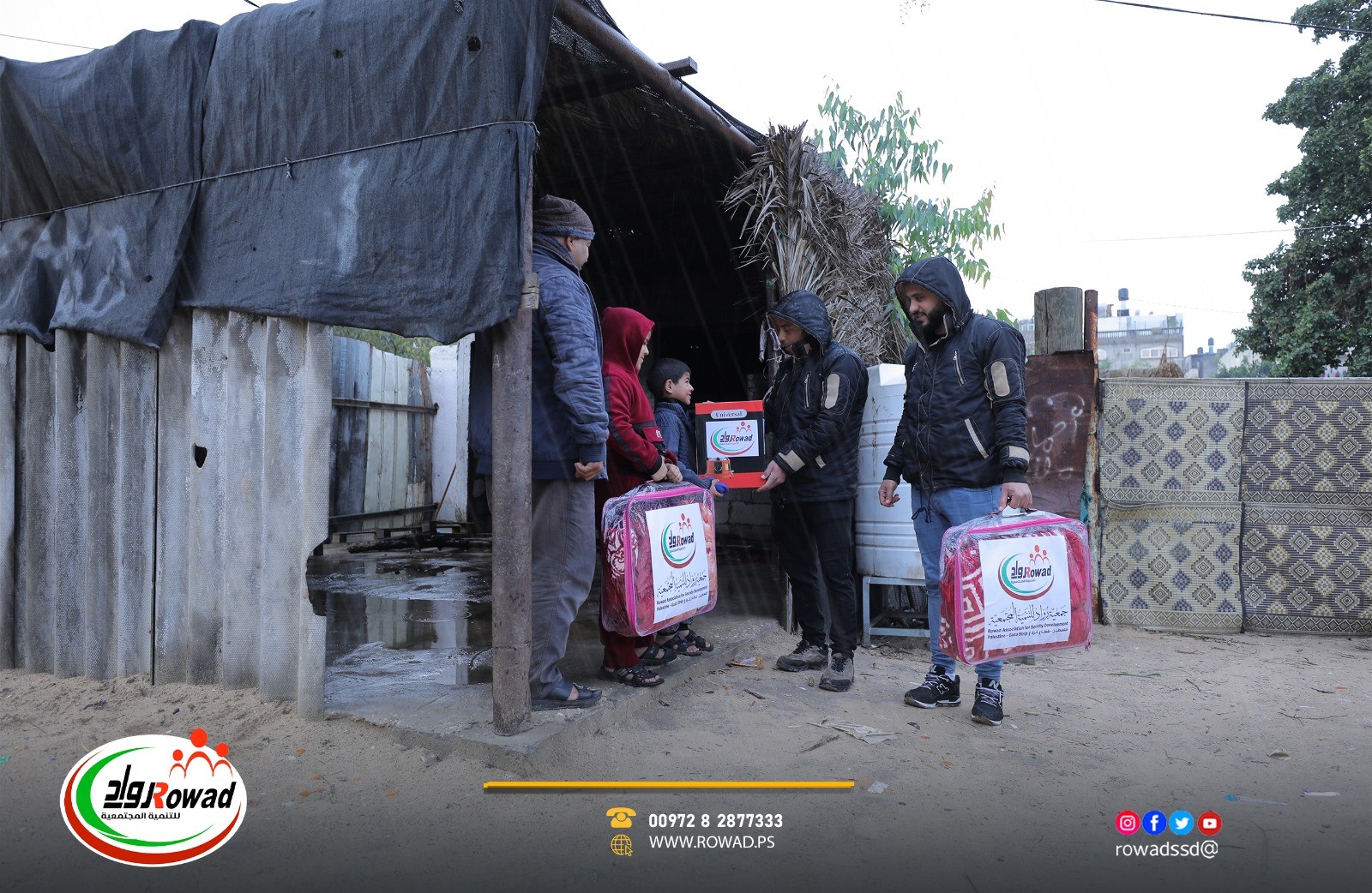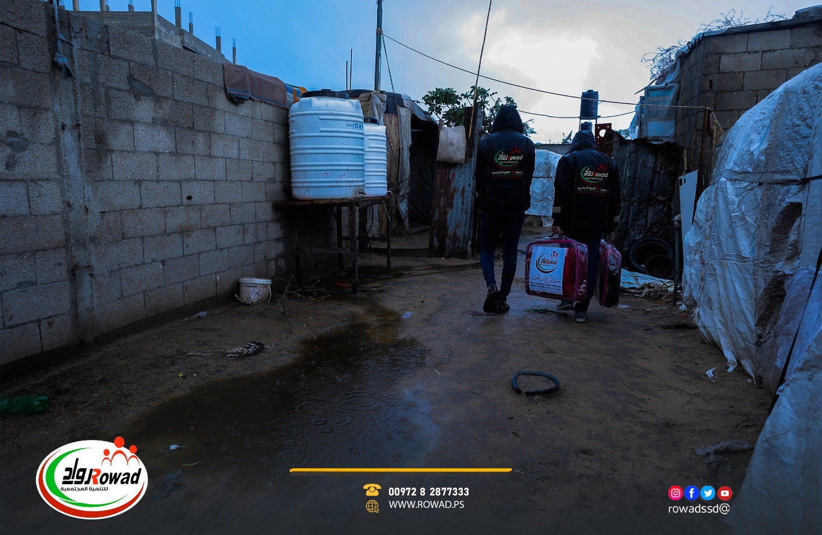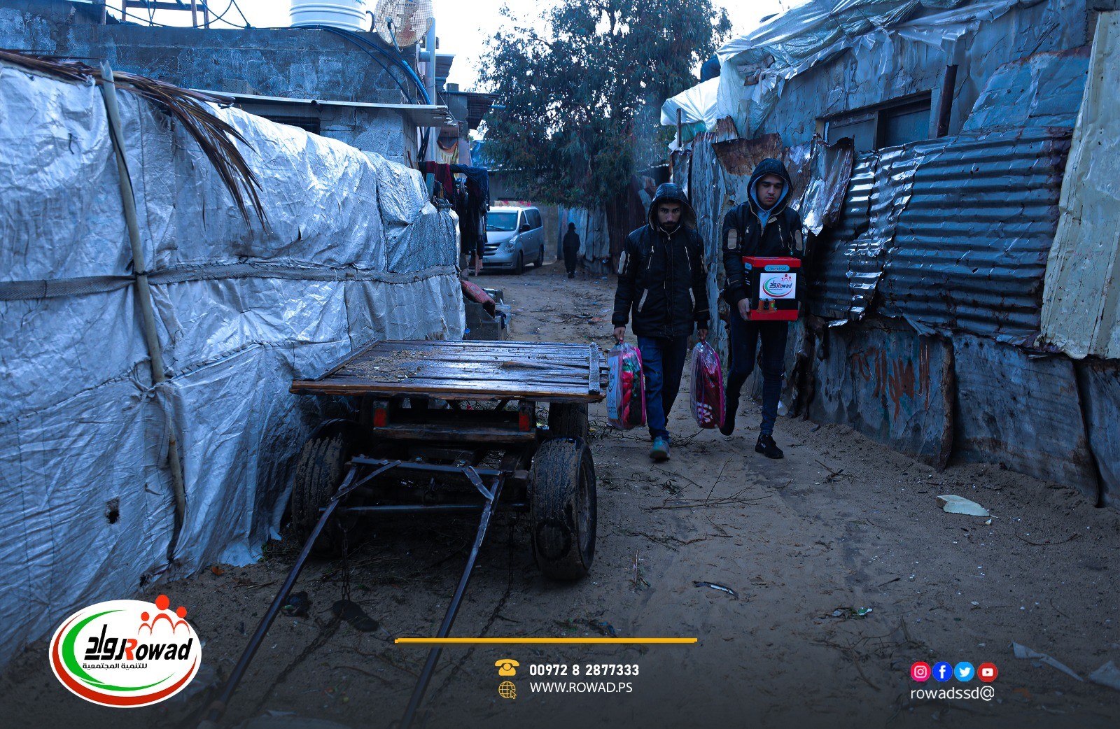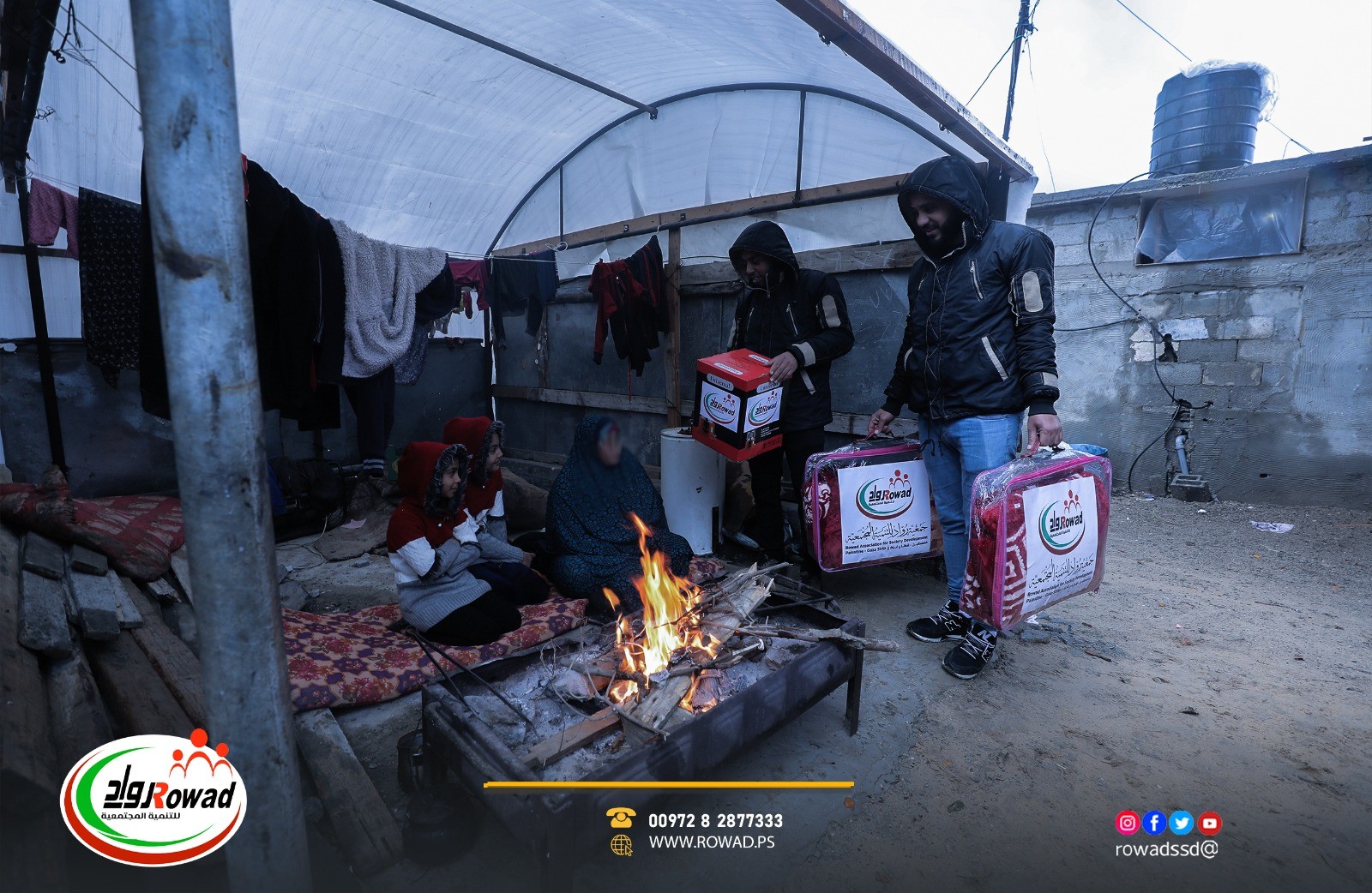 فريق جمعية رواد يواصل عمله منذ ساعات الصباح الباكر حتى هذه اللحظات في تفقد عشرات البيوت المستورة وتأمينهم بالطرود التموينية والكسوة الشتوية الكاملة بالإضافة للبطانيات الحرارية والمَدافِئ وتغطية البيوت المهترئة بالنايلون.