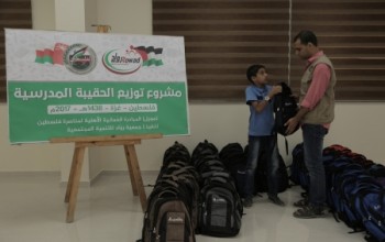 Rowad Society for Social Development distributed school bags to the poor students in Gaza as a part of a series of relief pr ...