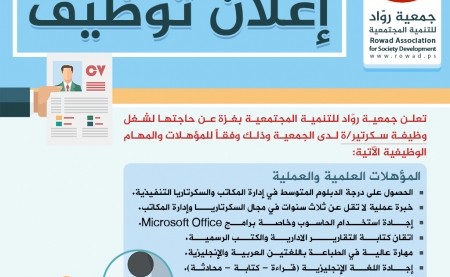 تعلن جمعية روّاد للتنمية المجتمعية بغزة عن حاجتها لشغل وظيفة سكرتير/ة لدى الجمعية وذلك وفقاً للمؤهلات والمهام الوظيفية الآتية: